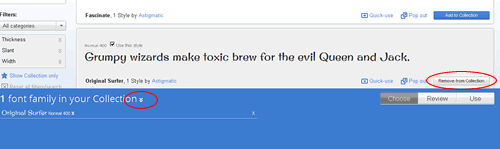 Las fuentes se van agregando a la barra inferior, que se puede minimizar haciendo clic en las flechitas al lado de «in your collection». De ahí se pueden eliminar del «carrito» mediante el aspa que aparece al lado del nombre de la fuente.